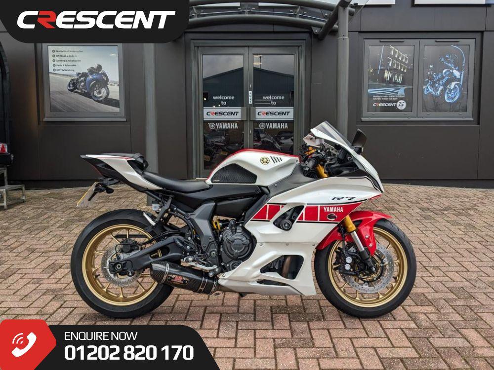We are proud to offer this well equipped 2022 Yamaha R7 finished in the fantastic 70th Anniversary colour scheme with just 7958 miles. This 2 owner machine benefits from very recent Pirelli tyres & 4 service entries including a fresh service for the next lucky owner. The list of extras include YOSHIMURA EXHAUST SYSTEM | YAMAHA QUICKSHIFTER | R&G PADDOCK BOBBINS | YAMAHA TAIL TIDY | YAMAHA TANK PADS | EVOTECH FRAME BOBBINS | YAMAHA RADIATOR GUARD | R&G FRONT AXLE BOBBINS. Please note, Quadlock has been removed & returned to the previous owner.